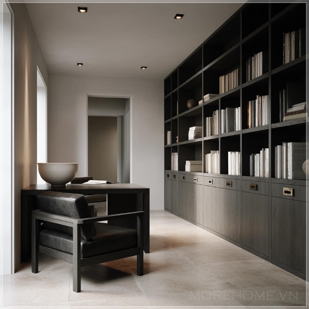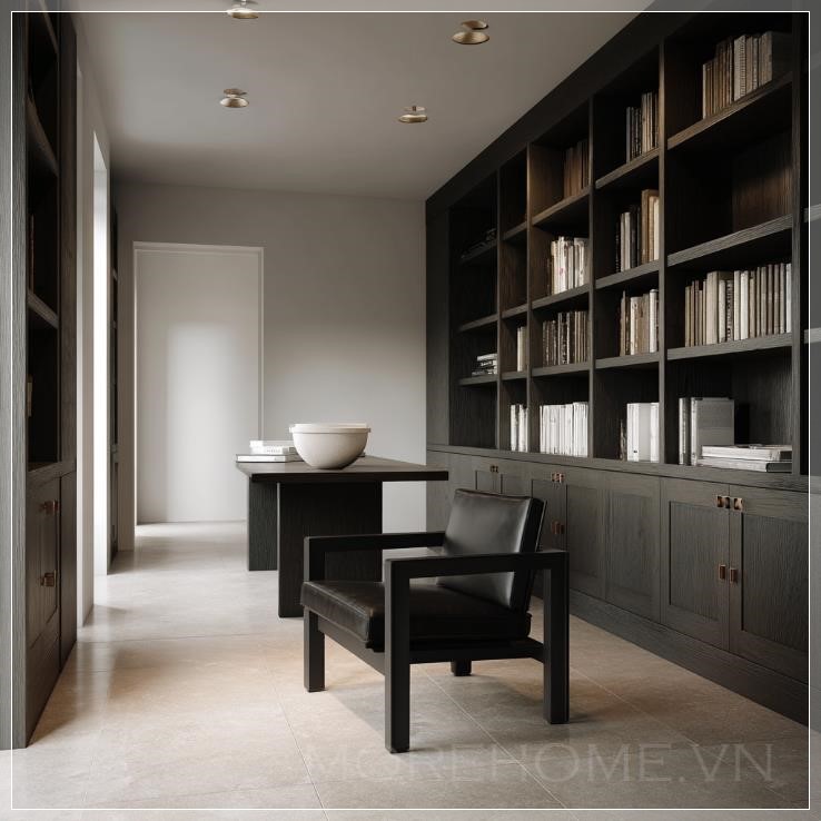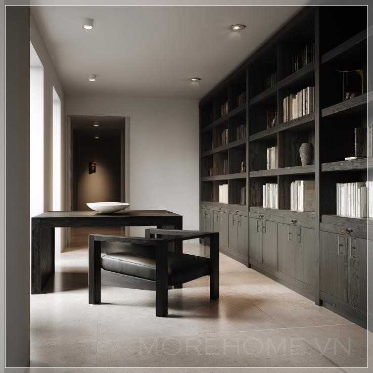Một không gian nội thất kiến trúc, góc chụp ngang tầm mắt ở độ cao 135 cm. Một góc học tập-thư viện hẹp với kệ sách xây dựng từ tường đến tường làm từ gỗ sồi được chải sợi, nhuộm đen than chì, mang phong cách tối giản và mờ, với kệ mở phía trên và cửa tủ liền mặt phía dưới. Các cuốn sách đều có màu trắng hoặc đơn sắc, được sắp xếp chính xác, với một chiếc bát gốm trắng đơn giản làm điểm nhấn nghệ thuật. Phía trước là một bàn làm việc làm từ gỗ sơn đen đậm, với tay nắm cắt hình chữ nhật, chắc chắn và đồ sộ. Một chiếc ghế bành hiện đại màu đen mờ với đệm và tựa lưng bằng da, lấy cảm hứng từ Bauhaus, phong cách tối giản và vuông vắn. Sàn nhà lát đá vôi mài honed kích thước lớn với tông màu nhạt mềm mại, có lỗ nhỏ và những khuyết điểm tự nhiên. Các bức tường màu trắng siêu mờ, ánh sáng chiếu từ hai bóng đèn âm trần, nhẹ nhàng và tự nhiên, với những bóng đổ nhẹ. Không gian mang đậm phong cách sang trọng yên tĩnh, Liaigre, Studio KO, tối giản cực đoan, bố cục sạch sẽ, ánh sáng nghệ thuật, sự hoàn hảo trong những khuyết điểm.