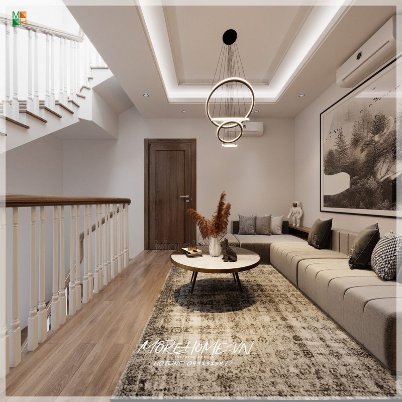 Chiếc đèn thả được treo chính giữa bộ bàn trà với thiết kế mảnh mai song lại rất tinh tế và chắc chắn. Điều này góp phần tô điểm thêm nét nổi bật cho phòng khách chung cư.