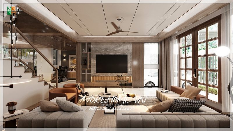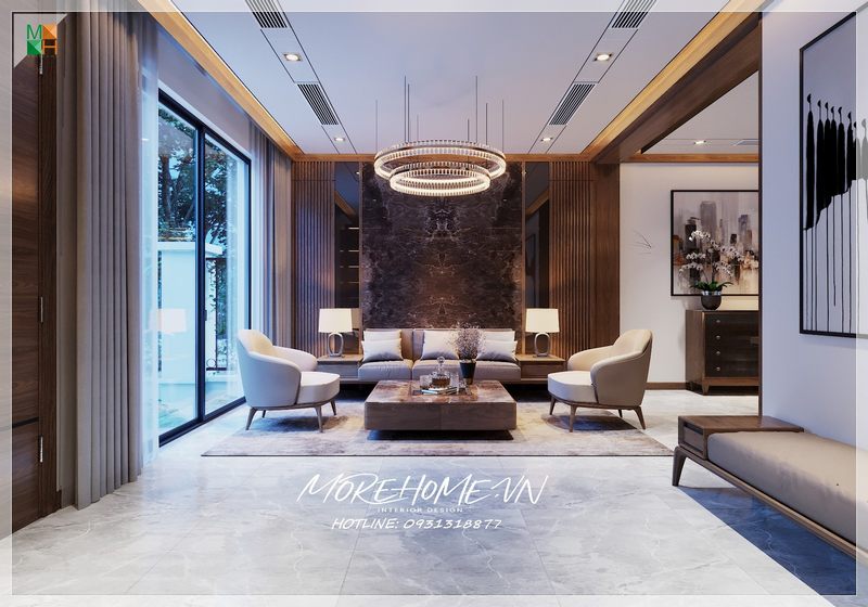 Bộ bàn ghế sofa có tông màu nhã nhặn hiện đại cao cấp được đặt ở vị trí trung tâm của căn phòng khách biệt thự, nhà phố làm nổi bật lên không gian chính của căn nhà
