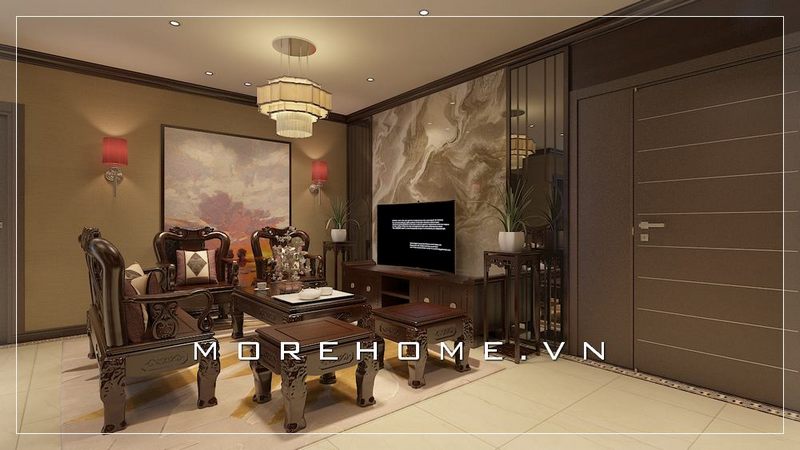 Phòng khách được trang trí đẹp bởi bộ bàn ghế sofa gỗ óc chó bọc bằng da tinh tế.