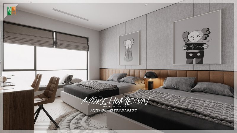 Phòng ngủ con được thiết kế đầy ấn tượng với những chi tiết nội thất đơn giản, hiện đại nhưng không quá phức tạp, tạo nên cảm giác thoải mái.