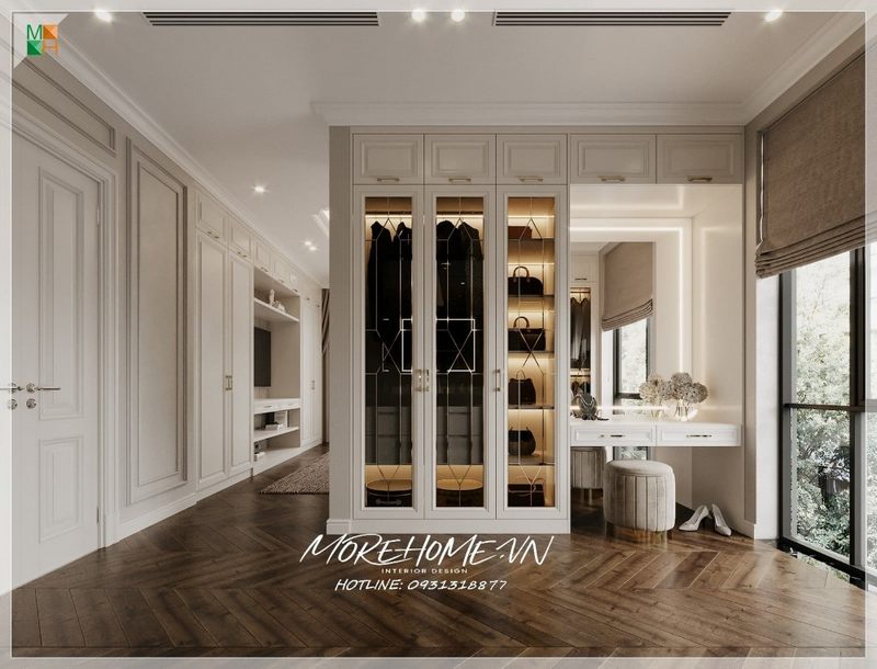 Phòng ngủ Master cao cấp được thiết kế với phòng thay đồ và toàn bộ nội thất trong phòng được làm bằng gỗ tự nhiên sơn trắng, phối kính cường lực và phụ kiện mạ vàng sang trọng.